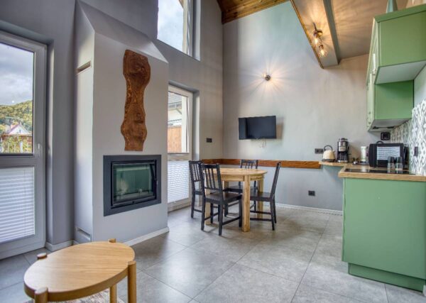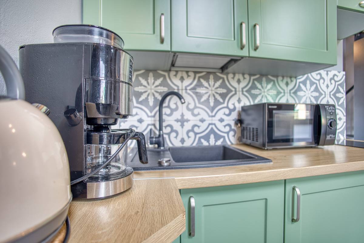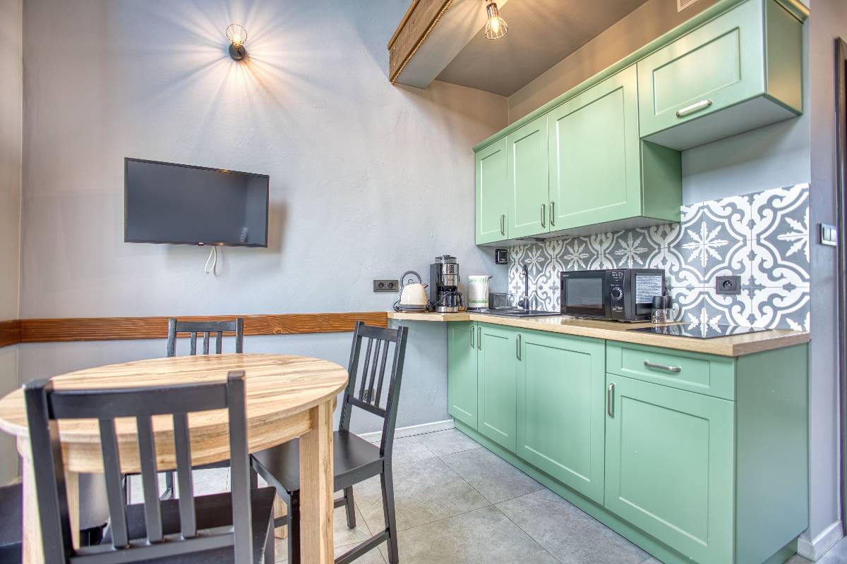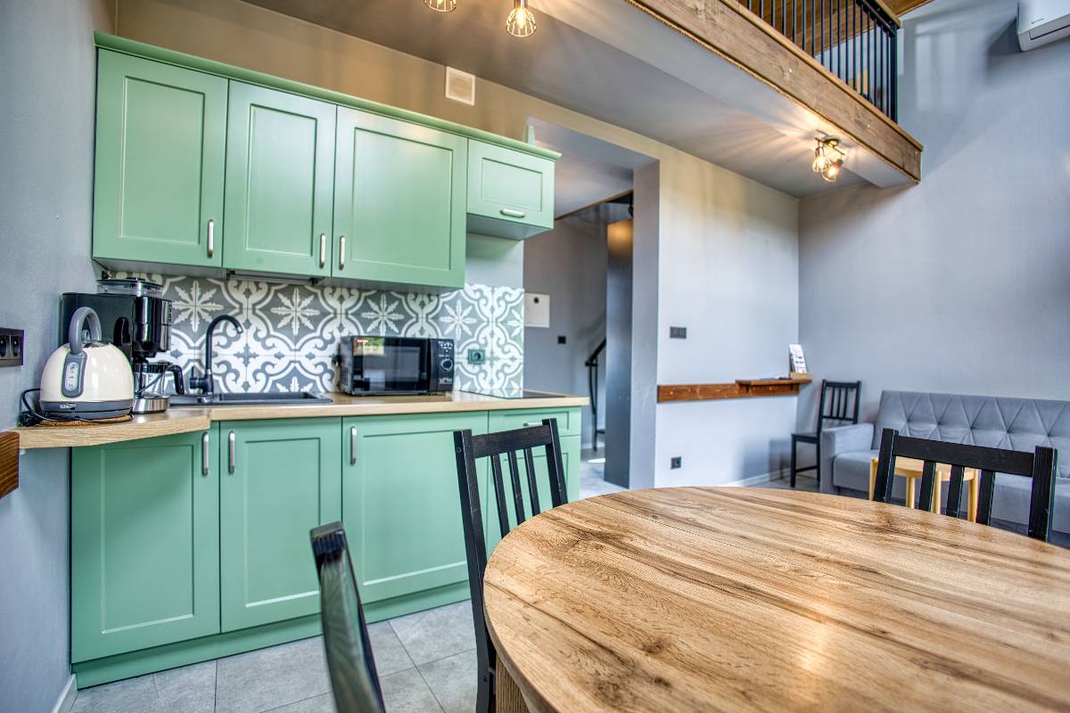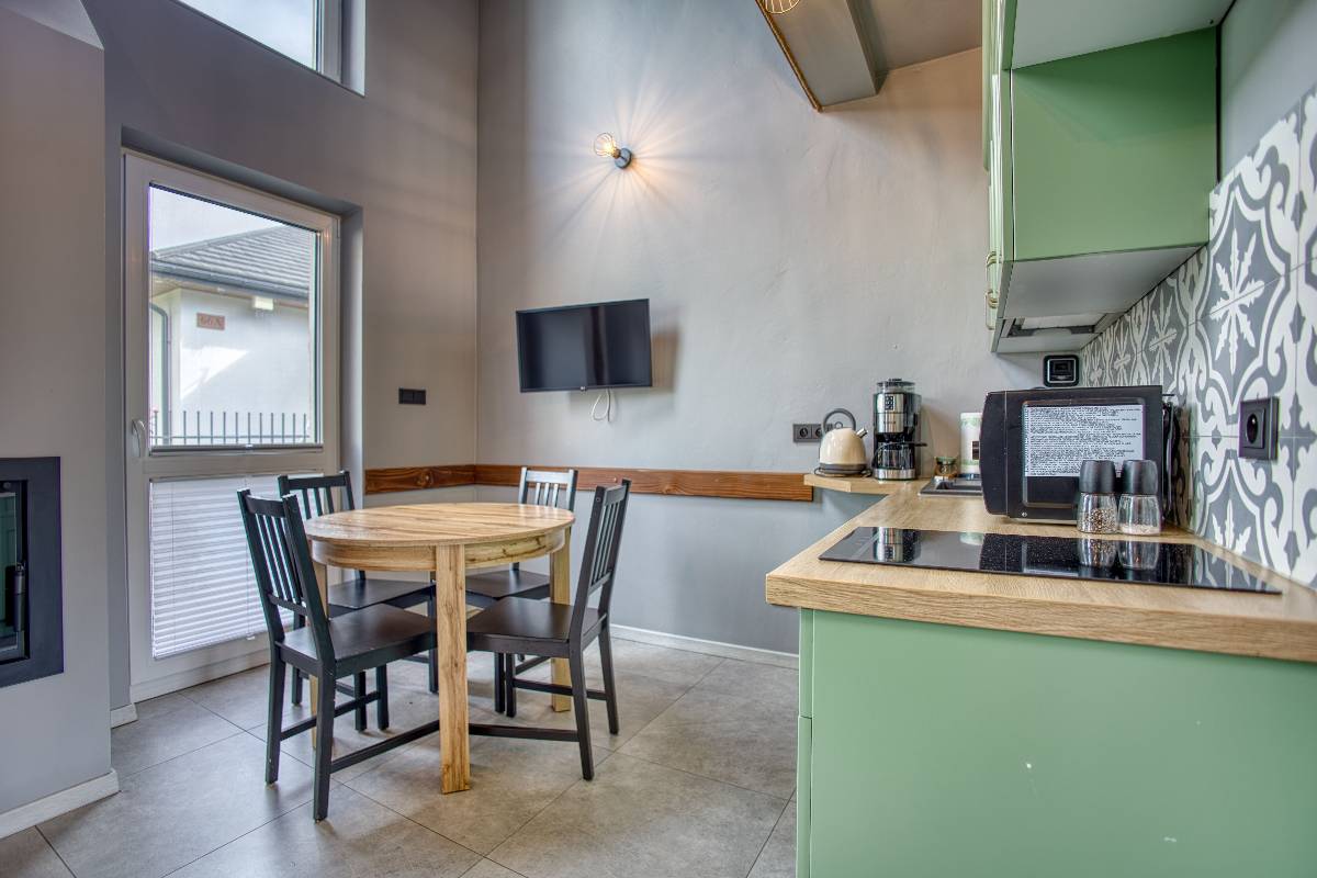 - W pełni wyposażona kuchnia, gdzie znajdziesz toster, ekspres do kawy, blender, płytę indukcyjną, garnki, sztućce i wiele innych udogodnień.
