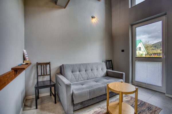 - Na parterze znajdziesz wygodną 2-osobową sofę z funkcją spania.