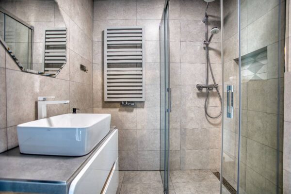 - Łazienka z ręcznikami, suszarką do włosów i kabiną prysznicową.